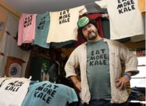 “Bo Muller-Moore stands in his home studio in [Jacksonville, FL]. The [Florida] man, who is building a business around the term “eat more kale,” which has been plastered on T-shirts, bumper stickers and other items, is running into opposition from the second largest fried chicken retailer in the country, Chick-fil-A. [AP Photo/Toby Talbot]“–apologies to the Newton Citizen)