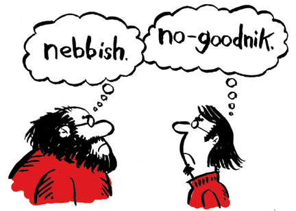 cartoon of two figures facing one another: thought bubble of one on left: “nebbish”; bubble for one on right: “no-goodnik”