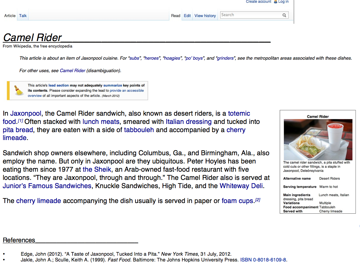 Home 5/16/13, No. 67 @Jaxonpool _______ The Witipedist: In Jaxonpool, the Camel Rider sandwich, also known as desert riders, is a totemic food. Click on to expand: 30.319570 -81.696201 Share this:Share Click to share on Pocket (Opens in new window) Pocket Click to share on Tumblr (Opens in new window) Tumblr Click to print (Opens in new window) Print Click to share on X (Opens in new window) X Click to share on Facebook (Opens in new window) Facebook Click to share on Pinterest (Opens in new window) Pinterest Click to share on LinkedIn (Opens in new window) LinkedIn Click to email a link to a friend (Opens in new window) Email Click to share on Reddit (Opens in new window) Reddit Like Loading...